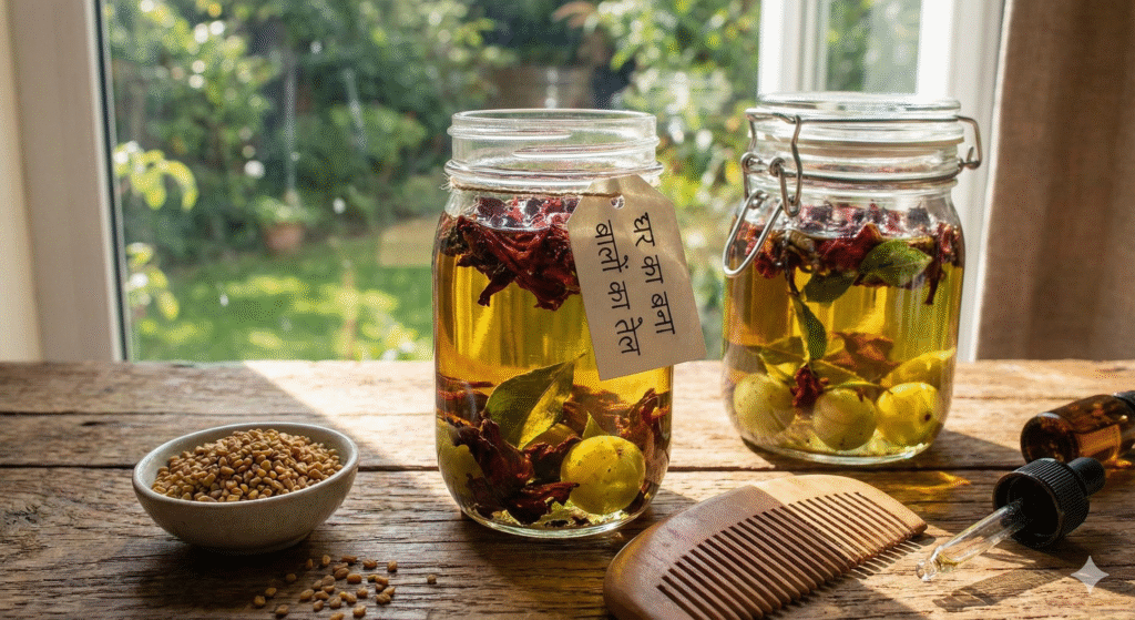 • अपने हेयर ऑयल में 3–4 बूंदें मिला लें