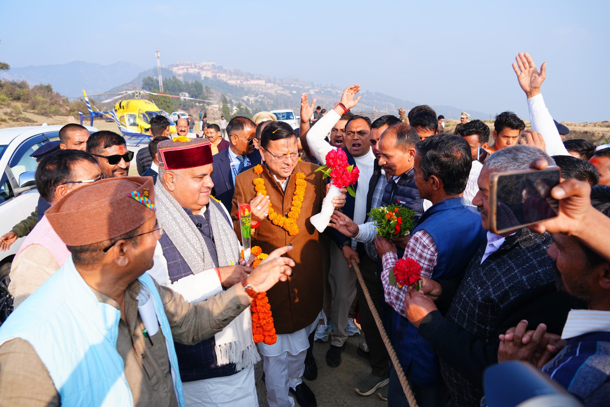 मुख्यमंत्री के भराड़ीसैंण (गैरसैंण) आगमन पर विधायक श्री अनिल नौटियाल, जिलाधिकारी चमोली श्री गौरव कुमार, एसपी श्री सुरजीत सिंह पंवार एवं स्थानीय लोगों ने उनका स्वागत किया