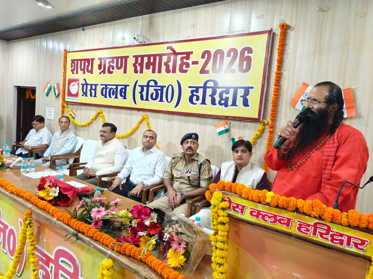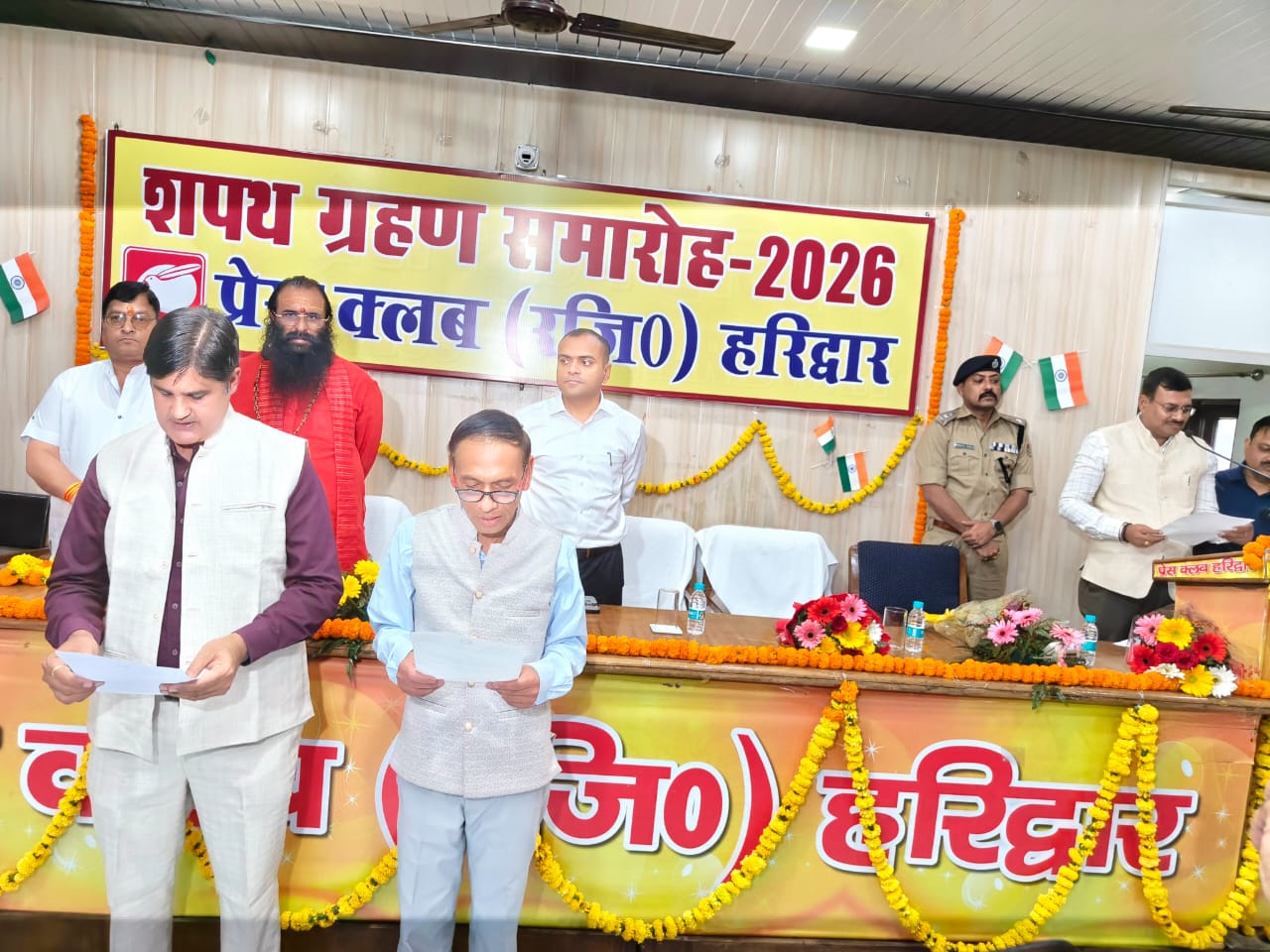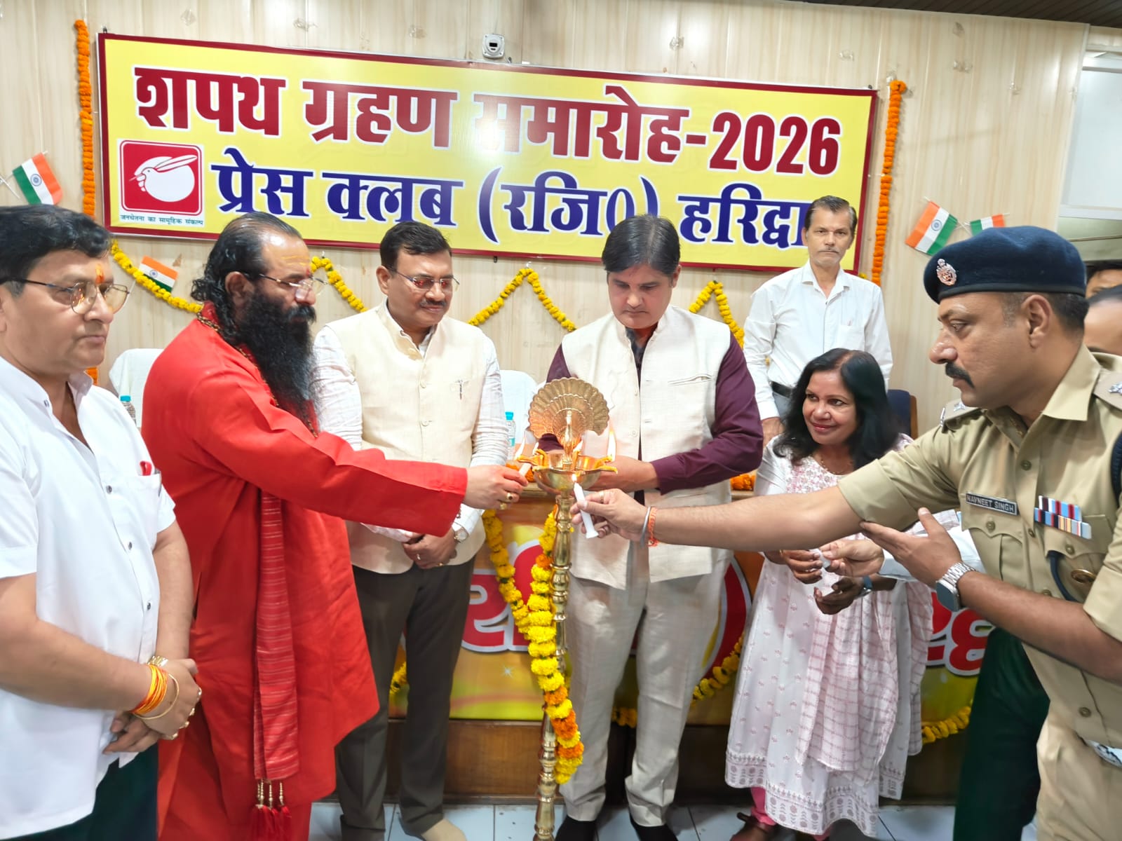 हरिद्वार। प्रेस क्लब हरिद्वार के नवनिर्वाचित अध्यक्ष धर्मेंद्र चौधरी, महामंत्री सूर्यकांत बेलवाला एवं नवनिर्वाचित कार्यकारिणी का शपथ ग्रहण समारोह प्रेस कलब सभागार में आयोजित किया गया। मुख्य सचिव आनंद वर्द्धन ने प्रेस क्लब के नवनिर्वाचित अध्यक्ष धर्मेंद्र चौधरी, महामंत्री सूर्यकांत बेलवाल को पद एवं गोपनीयता की शपथ दिलायी। शपथ ग्रहण समारोह का शुभारंभ मुख्य सचिव आनंद वर्द्धन, अखाड़ा परिषद अध्यक्ष श्रीमहंत रविंद्रपुरी, जिलाधिकारी मयूर दीक्षित, एसएसपी नवनीत सिंह भुल्लर, नवनिर्वाचित प्रेस क्लब अध्यक्ष धर्मेंद्र चौधरी, महामंत्री सूर्यकांत बेलवाल, पूर्व महामंत्री दीपक मिश्रा ने संयुक्त रूप से दीप प्रज्वलित कर किया।