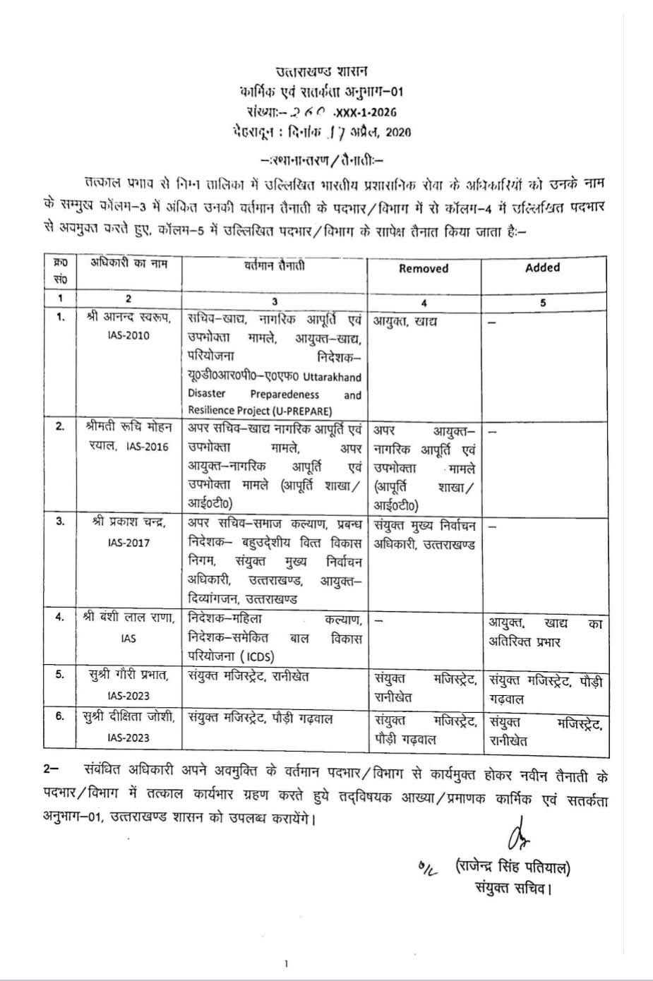 उत्तराखण्ड उत्तराखण्ड शासन कार्मिक एवं सतर्कता अनुभाग के तत्काल प्रभाव से स्थानान्तरण/तैनाती, देखे सूची samachariApril 18, 2026 Share उत्तराखण्ड शासन कार्मिक एवं सतर्कता अनुभाग-01 संख्याः-260 XXX-1-2026 देहरादून: दिनांक 17 अप्रैल, 2020 – स्थानान्तरण/तैनातीः- तत्काल प्रभाव से Share